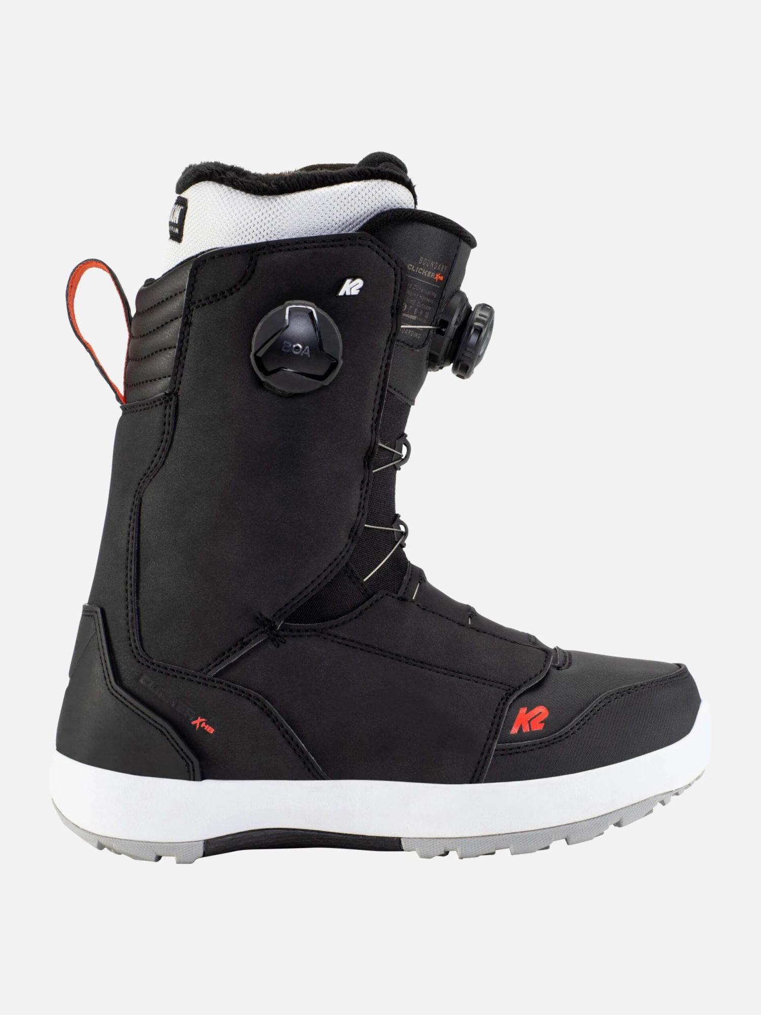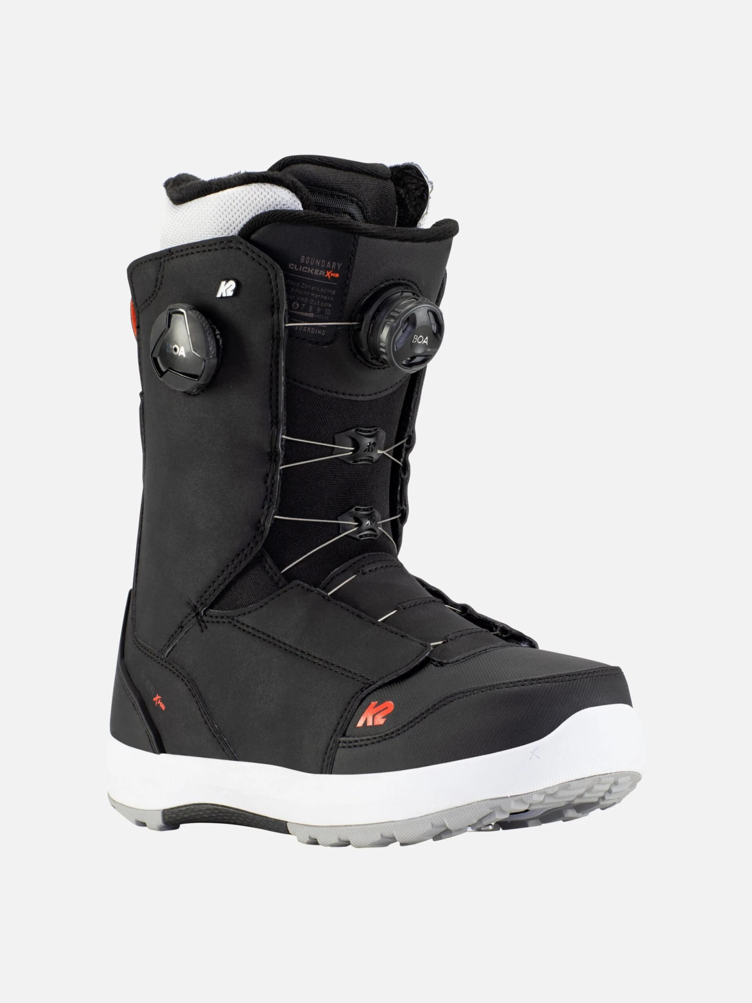 The K2 Boundary Clicker™ X HB snowboard boot features a dual zone closure with BOA® Fit System to micro-tune your fit. A dedicated BOA® dial for the upper portion of the shell and a second dedicated to closing the lower portion of the shell. The upper cuff of the boot is constructed with our HDR Premium Synthetics and features a fully articulating design, upping the durability factor while reducing the distortion of the shell as it flexes forward.