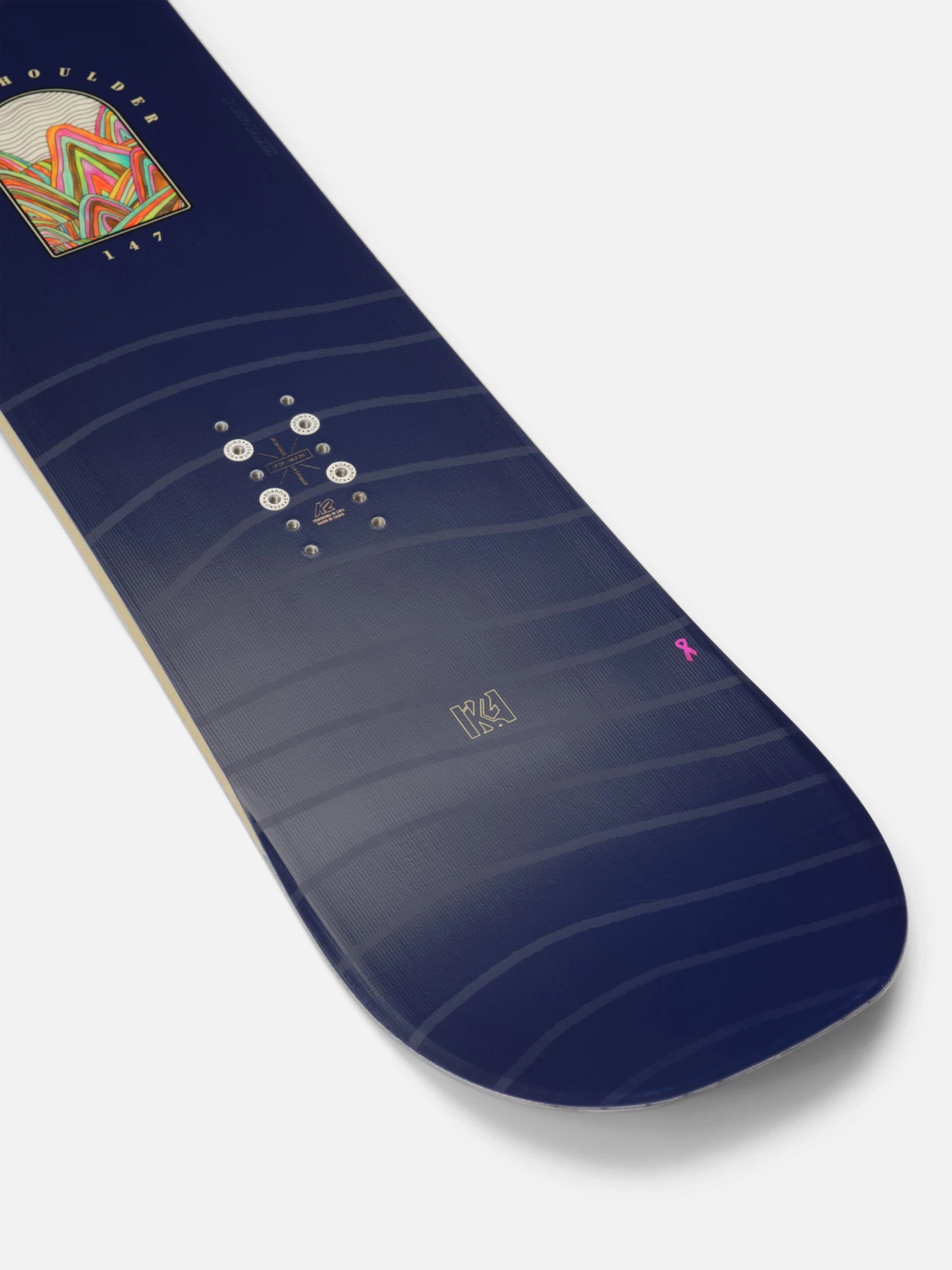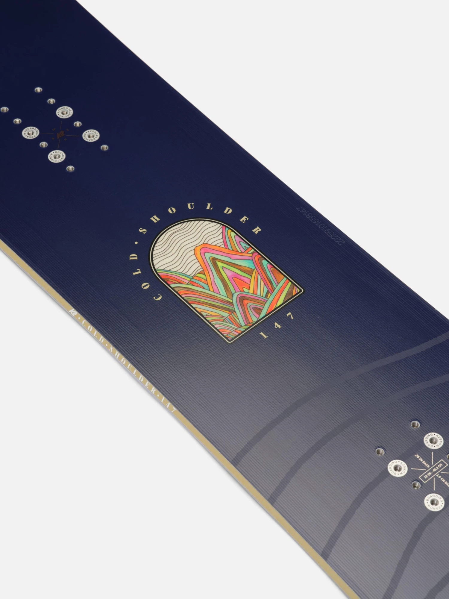 Designed for the intermediate- to- expert snowboarder, the K2 Cold Shoulder features a Combination Camber profile that places camber in between the feet for snap, stability, and adds rocker profile outside the bindings for playful and intuitive turn initiation. A small amount of rise in the tail helps keep the board lively and predictable, while a long-extended rocker profile in the tip helps to ease turn initiation and float in powder.