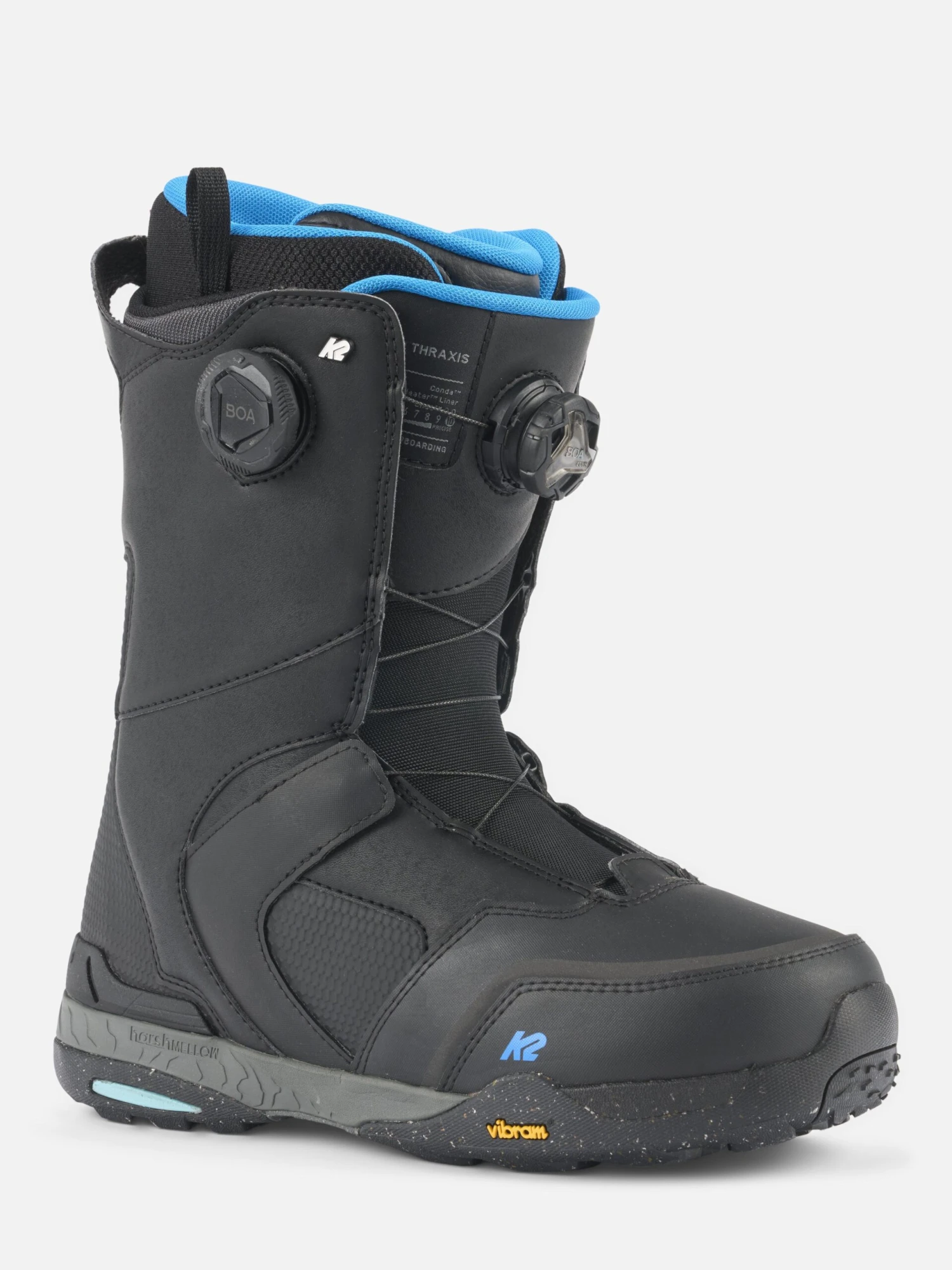 The Thraxis’ Zonal BOA® Fit System features three BOA® dials, two targeting zonal exterior lacing, and one controlled K2’s Conda™ liner lacing system. By placing a soft, urethane “chip” around the 45° degree of the ankle, we’ve allowed riders to micro-adjust their boot fit and eliminate heel lift. Wrapping the foot, we’ve placed our most supportive liner, composed of multiple densities of heat-moldable Intuition® foam. This open-cell foam means that it can be re-molded time and time again to achieve the perfect fit throughout the boot’s life. The liner is outfitted with our breathable and heat reflecting Spaceheater™ material, keeping riders warm and dry all day long. And lastly, we’ve integrated a 95% post-consumer recycled coffee mesh from SCafe™ into the liner to help eliminate unwanted odor after a long day on the hill. Underfoot, the midsole combines a lightweight and stable EVA and Harshmellow™, a proprietary technology that helps absorb impact, increase damping, and provides a “quieter” feel while snowboarding.